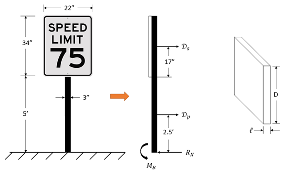 A 22 inch by 34 inch speed limit sign is supported on a 3 inch-wide, 5 ft-long pole. Estimate the bending moment in the pole at ground level when a 30 mph wind blows against the sign. Assume aspect ratio for the sign is less than 0.1. Assume the pole is a square rod with sharp corners. Also assume the density of air is 0.00238 slug/ft^3. Note the drag force coefficient of a squared rod with sharp corners is 2.2.